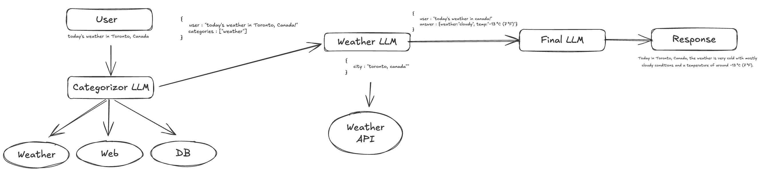 In the image above, the flow starts when a user asks something like today’s weather in Toronto, Canada. This request reaches the agent. From the categorization step, the agent already knows that this is a weather related task.